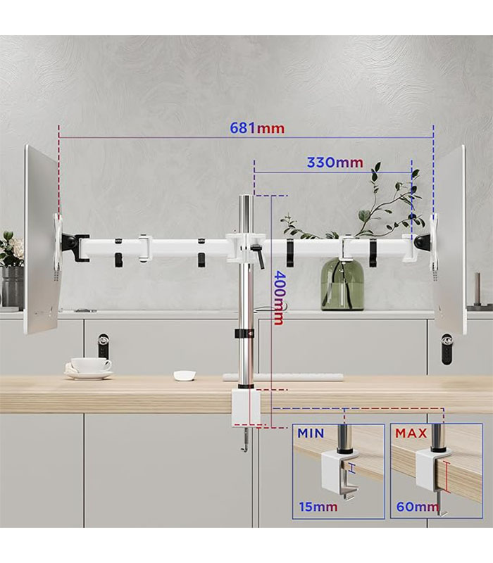 - Supports dual monitors 13″-27″, max 8kg each