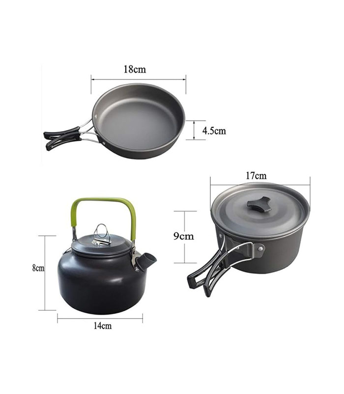 Includes: 1 camping pot, 1 pan, 1 teapot; comes with a nylon carry bag.