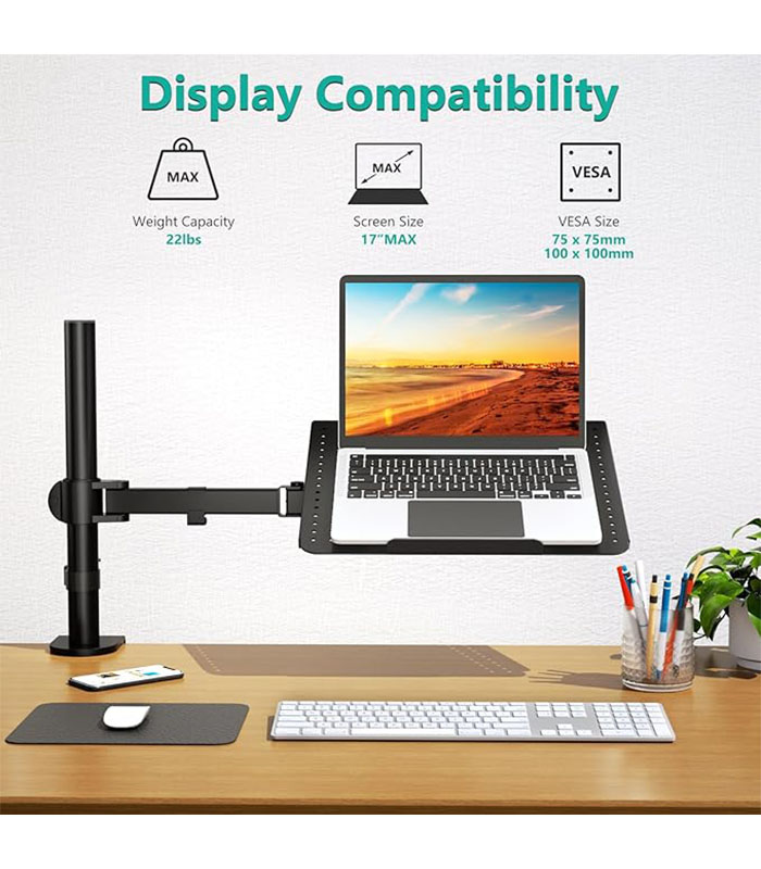 Wide Compatibility: Fits laptops up to 17″ and supports up to 10 kg; also compatible with monitors (75x75mm, 100x100mm VESA).